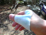 昨日きもさんがタイヤの空気圧を調整してくれて 、下るのが少し楽になった。グリップがイイ。今ま で絶対降りていたような下りも乗って降りる。 調子こいて降りていると、大転倒。「痛て」右手の 親指の付け根を痛めた。やっぱりテク以上のこと は無理しないようにしないと怪我をする。そういえ ば推奨装備の冷えピタを持ってきている。とりあえ ず貼っとこう。 |